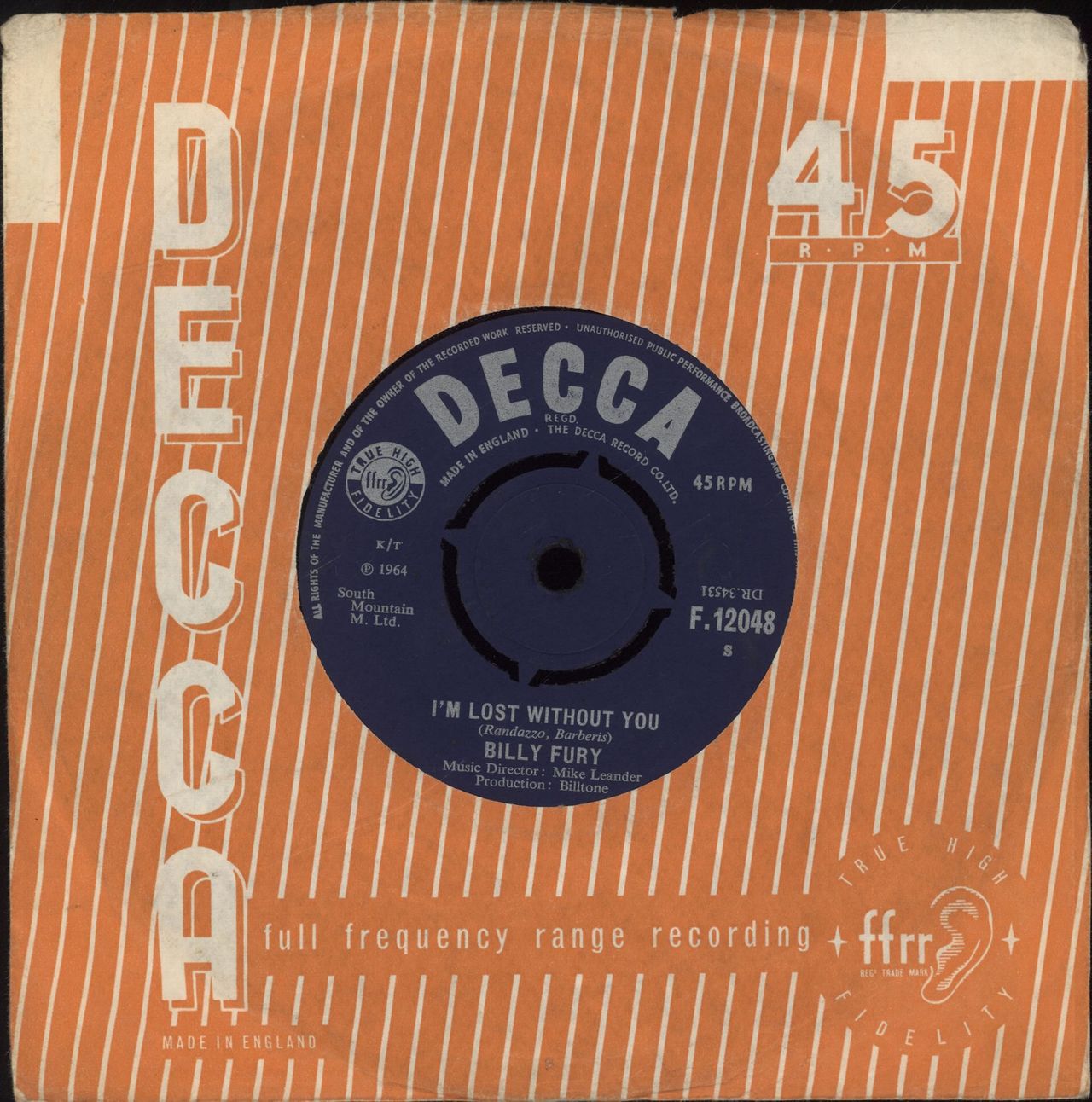 BILLY FURY I'm Lost Without You (1964 UK 7" vinyl single with intact four prong centre, also including You Better Believe It Baby. The vinyl shows some minor hairlines but is doing well for its age, nestled within a record company die-cut paper sleeve F.12048)