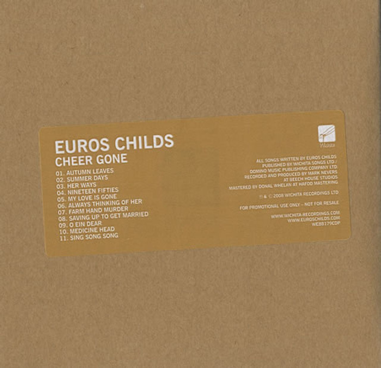 EUROS CHILDS Cheer Gone (2008 UK 11-track promotional CD of the Welsh singer / songwriter's fourth solo album. Created in Nashville, Tennessee with fellow musicians Steven Black [Bass] and Peter Richardson [Drums], this album has a slice of Americana mixed with Euros' usual folk sound. Custom printed disc issued in the Wichita company card sleeve with title / tracklisting and release information stickers WEBB179CDP)