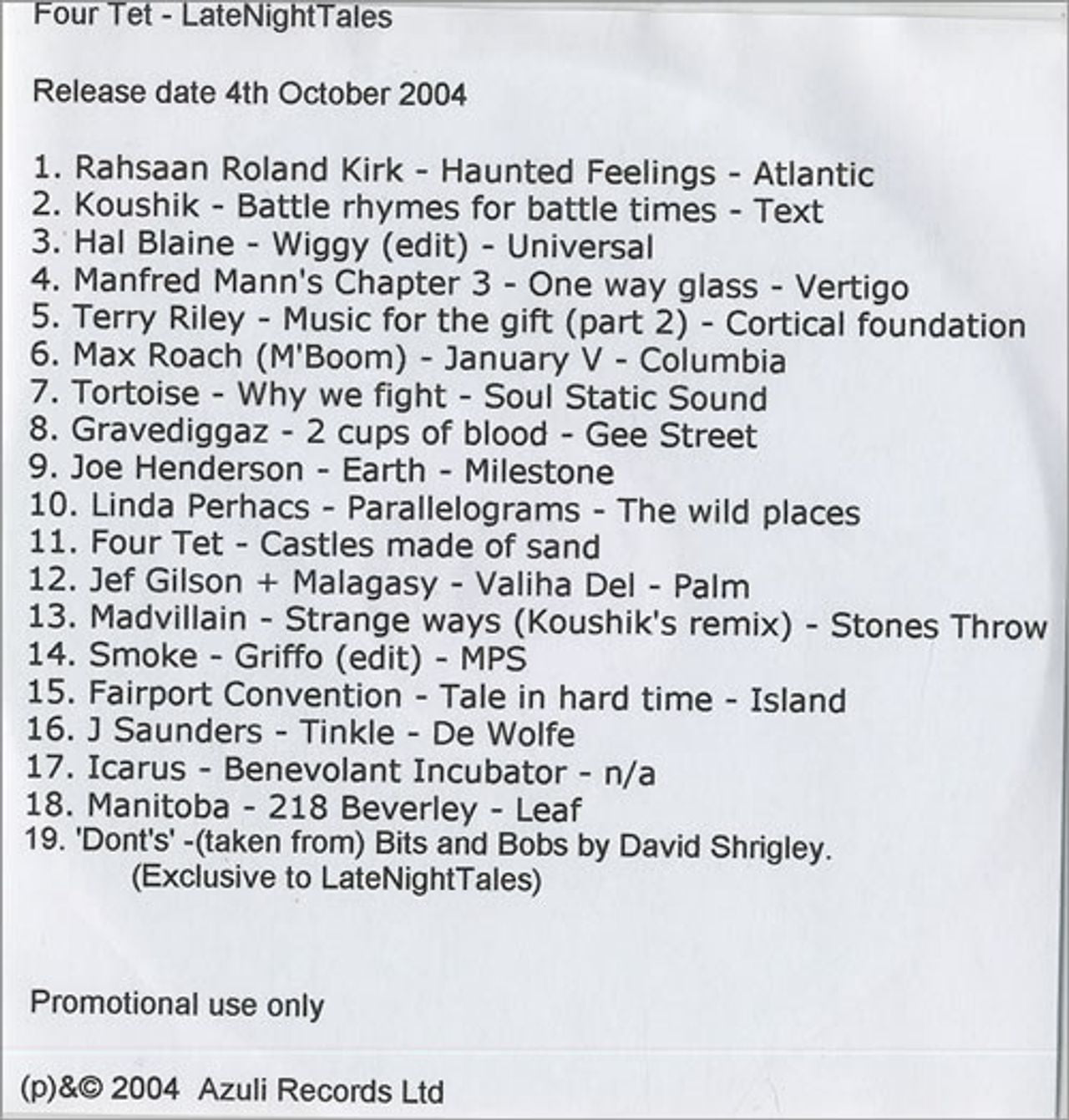 FOUR TET Late Night Tales (2004 UK 19-track promotional CD-R acetate featuring Kieran Hebden's outing for the Late Night Tales series of albums which has seen artists from The Flaming Lips to Fatboy Slim choosing their faves! Includes some storming tracks such as; Manfred Mann's One Way Glass, Fairport Convention's Tale In Hard Time and Four Tet's cover of the sublime Hendrix classic Castles Made Of Sand. Custom stickered disc with a tracklisting inlay)