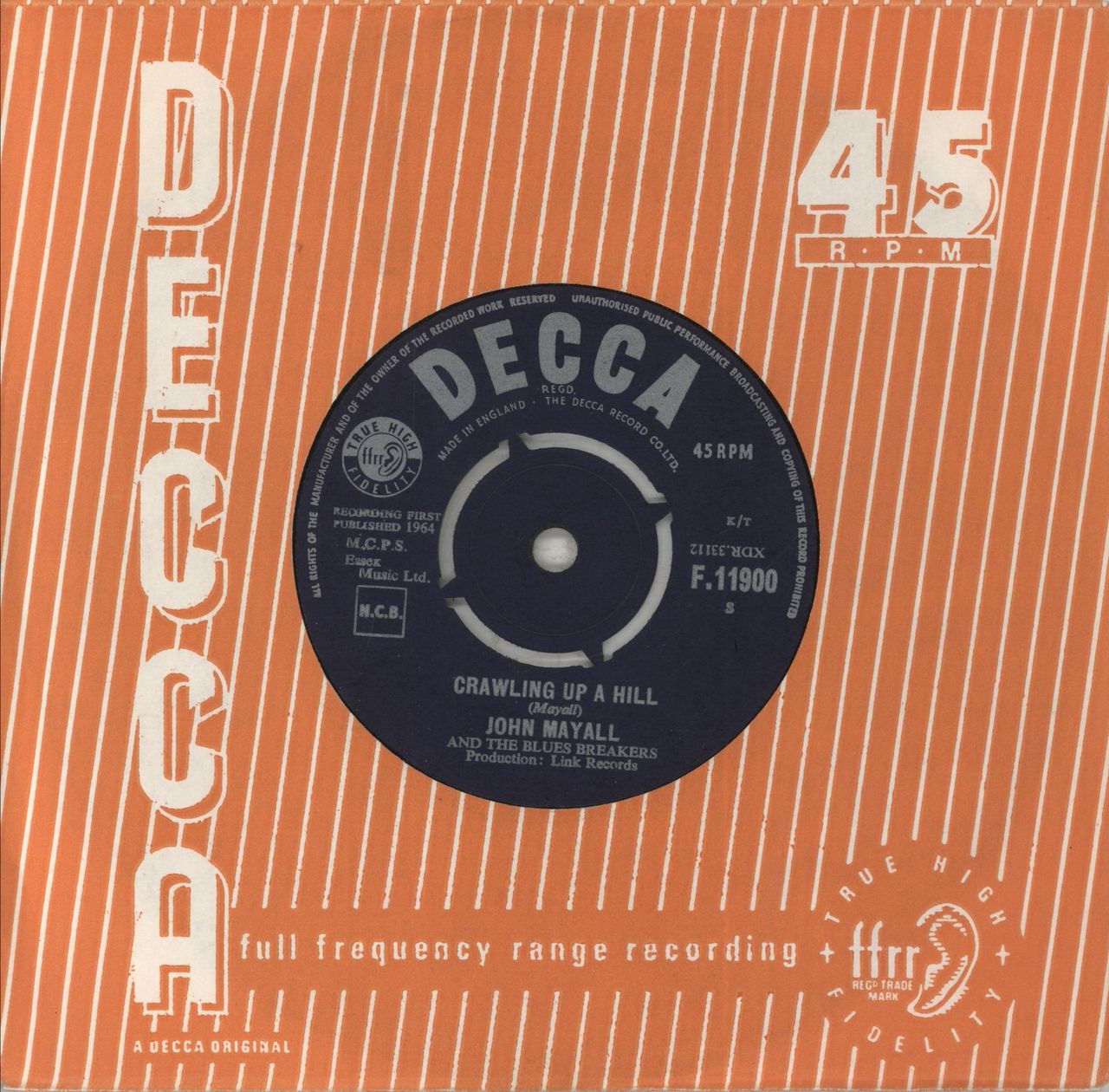 JOHN MAYALL Crawling Up A Hill (Rare 1964 UK 1st issue (with matrices ending in 1C) 7" vinyl single - Never a man to be messed with, this heavyweight R&B groover marks the very beginning of John and his magnificent Bluesbreakers' career with aBANG. Backed with the raw blues-er, Mr. James. The viny lwith intact 4-prong centre is VG with a few cosmetic hairlines, none of which are raised and upon a test play, we found there was a little background crackle, though no loud popping or skips to be found - An absolute Mod must-have! F.11900)