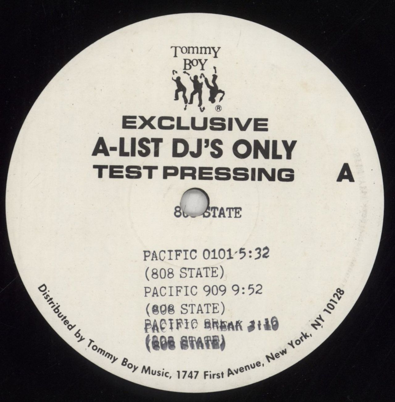 808 STATE Pacific (1990 US advance 'DJ Test Pressing' 6-track 12" EP on Tommy Boy with custom stamped black on white labels, featuring mixes by Justin Strauss & Musto & Bones - the UK release only had 3 versions. Housed in a plain die-cut sleeve, the vinyl is clean & in Excellent condition with minimal play TB949)