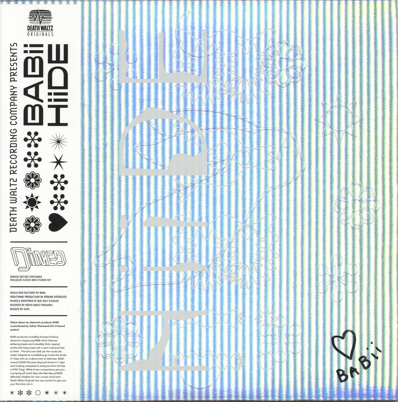 BABII Hiide (Dinked Edition 2019 UK limited edition 9-track Clear With White Splatter Vinyl LP - The debut album by electronic producer BABii was co-produced by Adrian Sherwood [On-U-Sound system] and features incredibly forward thinking electro tinged pop / R&B which displays skittering beats and incredibly thick, layered synths with heavy bass with a semi industrial feel to them. The lyrics are dark yet the vocals are sweet and despite its incredible pop hooks, the whole LP drips with an undercurrent of darkness. Numbered, debossed mirrorboard picture sleeve with wrap-around Death Waltz company obi, art insert, unused sticker sheet and download slip. The sleeve has been Autographed on the front my Babii in black marker pen. A Near Mint copy. Limited to only 450 copies)