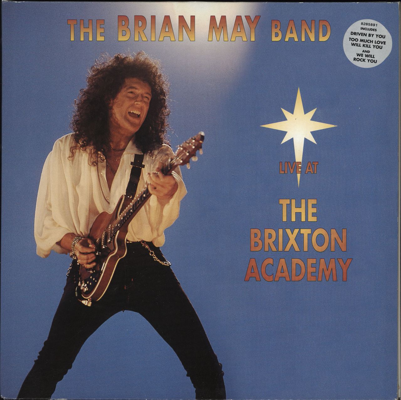 BRIAN MAY Live At The Brixton Academy (Rare 1994 UK 15-track vinyl 2-LP set, featuring a mixture of Queen and Brian's own solo material, including Tie Your Mother Down, We Will Rock You, Back To The Light and Driven By You; with printed innersand housed in a glossy gatefold picture sleeve. The sleeve displays light wear with some marks on the front (small residual price sticker mark) but no paper loss or splits, and the vinyl has also light signs of play - both graded Excellent PCSD150)