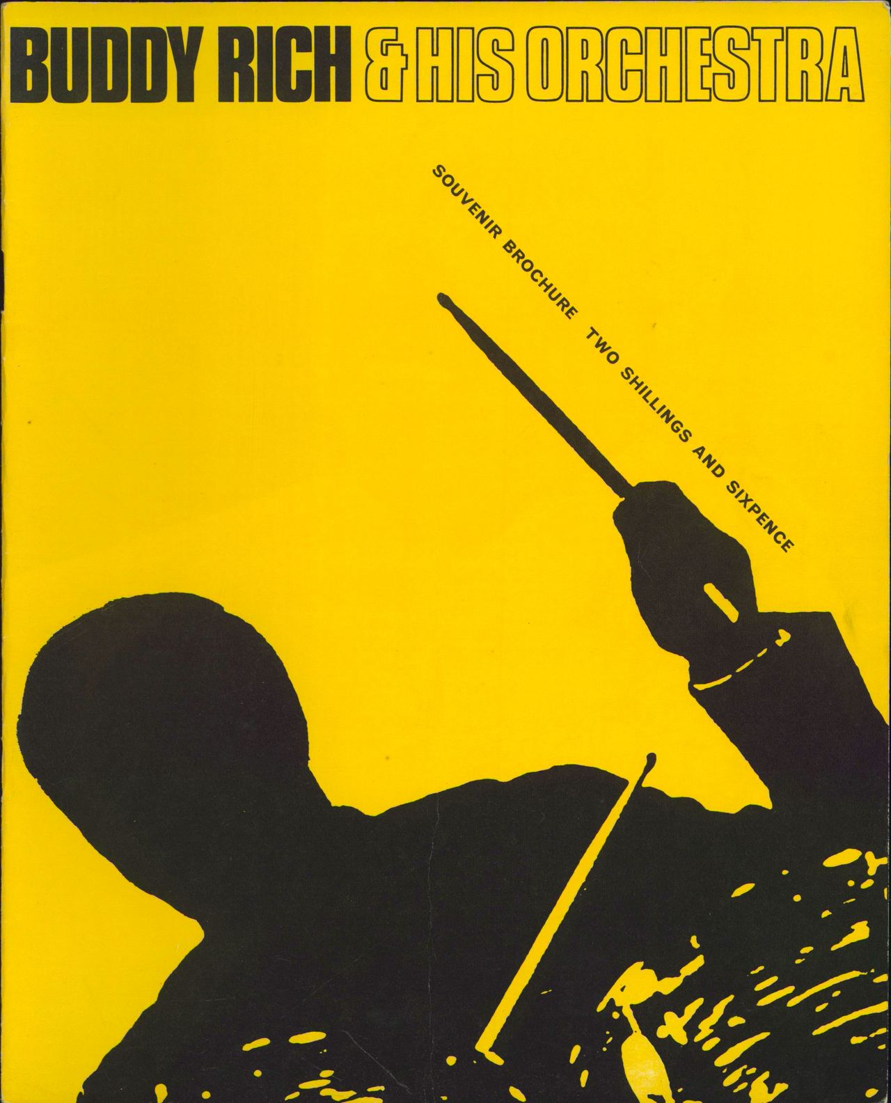 BUDDY RICH Buddy Rich 1967 Tour Programme (1967 UK 20-page 10" x 8" souvenir tour programme, packed with black & white photo's, jazz biography & advertisements, yellow and black silhouette picture sleeve. This copy shows little wear other than acrease along the middle and comes with two ticket stubs for the Saturday April 1st performance at the New Victoria Theatre, London)