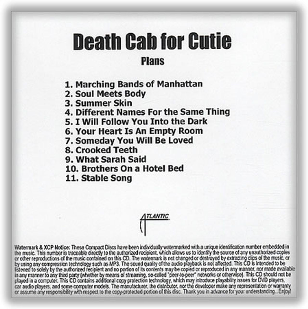 DEATH CAB FOR CUTIE Plans (2005 US Atlantic 11-track promotional CD-R acetate album, custom security coded numbered advance printed disc + title/tracklisting insert)