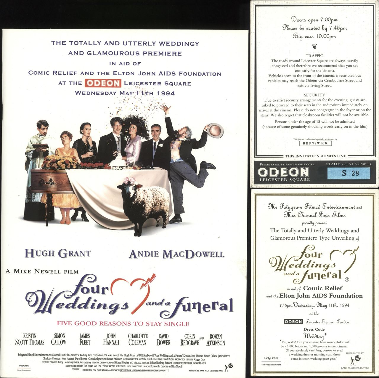 ELTON JOHN Four Weddings & The Funeral (1994 UK 32-page 11½" x 8" programme for premiere of the Mike Newell film Four Weddings & A Funeral in aid of Comic Relief and the Elton John AIDS Foundation at the Odeon Leicester Square in London on 11th May 1994. Includes an illustrated introduction to the AIDS Foundation by Elton John, along with details of the cast members including Hugh Grant, Andie MacDowell, Kristin Scott Thomas, Simon Callow and John Hannah. Also includes three gold embossed invitations to the premiere showing the Dress Code as Wedding)