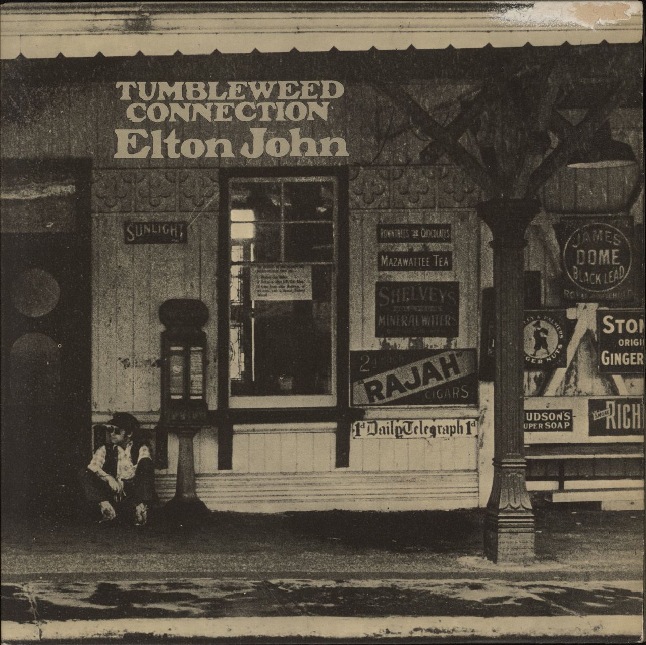 ELTON JOHN Tumbleweed Connection (1970 UK limited edition 10-track stereo LP pressed on black vinyl which is a translucent ruby red which is visible when held to a light source. Elton's third studio releaseis a concept album with themes based on Country and Western / Americana music. The textured gatefold picture sleeve shows just a little light shelfwear with a small area of paperloss to the top right corner but retains its integral twelve-page illustrated lyric booklet, and thevinyl remains excellent with few signs of play. The toughest coloured vinyl variant to find! DJLPS410)