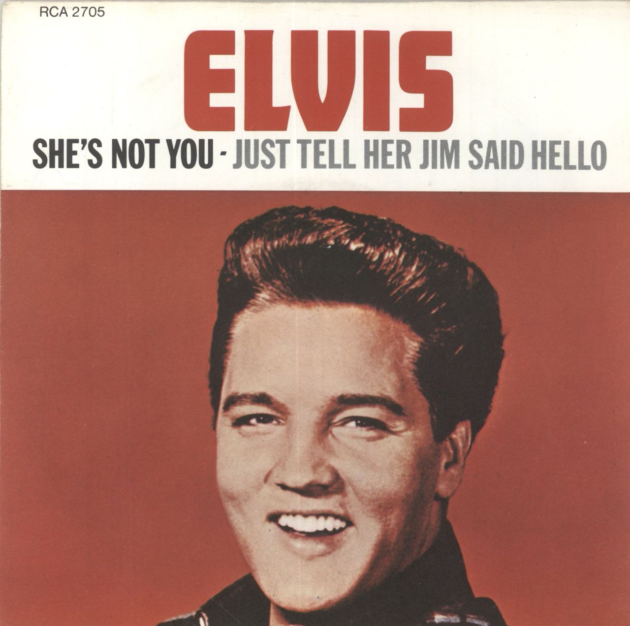 ELVIS PRESLEY She's Not You (1977 Canadian issue of his classic 1962 7" vinyl single with a wide centre on the tan/golden RCA labels, also including Just Tell Her Jim Said Hello, housed in a thin card picture sleeve pressed in the UK by DelgaPress Limited. The sleeve displays only light general wear and the vinyl has only light signs of play, an Excellent example RCA2705)