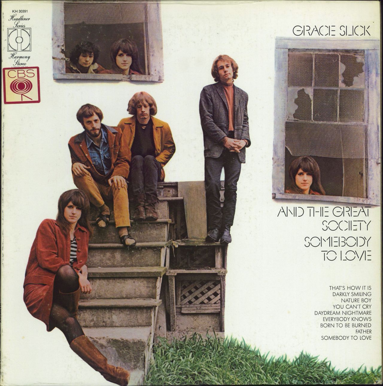 GRACE SLICK & THE GREAT SOCIETY Somebody To Love (1970 US beige label 9-track LP compilation, pasted picture sleeve. This copy was amended for export with a CBS sticker to the front and the perimeter of the labels overstickered with a red CBSborder. Both the sleeve & vinyl are Near Mint KH30391)