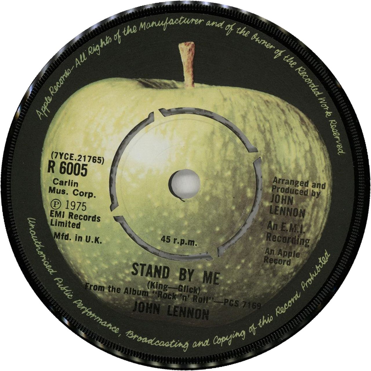 JOHN LENNON Stand By Me (Classic 1975 UK second label variant 7" vinyl single with the 'Carlin' music credit & intact original four prong centre, also featuring Move Over Ms. L, repro Apple die-cut paper sleeve R6005)