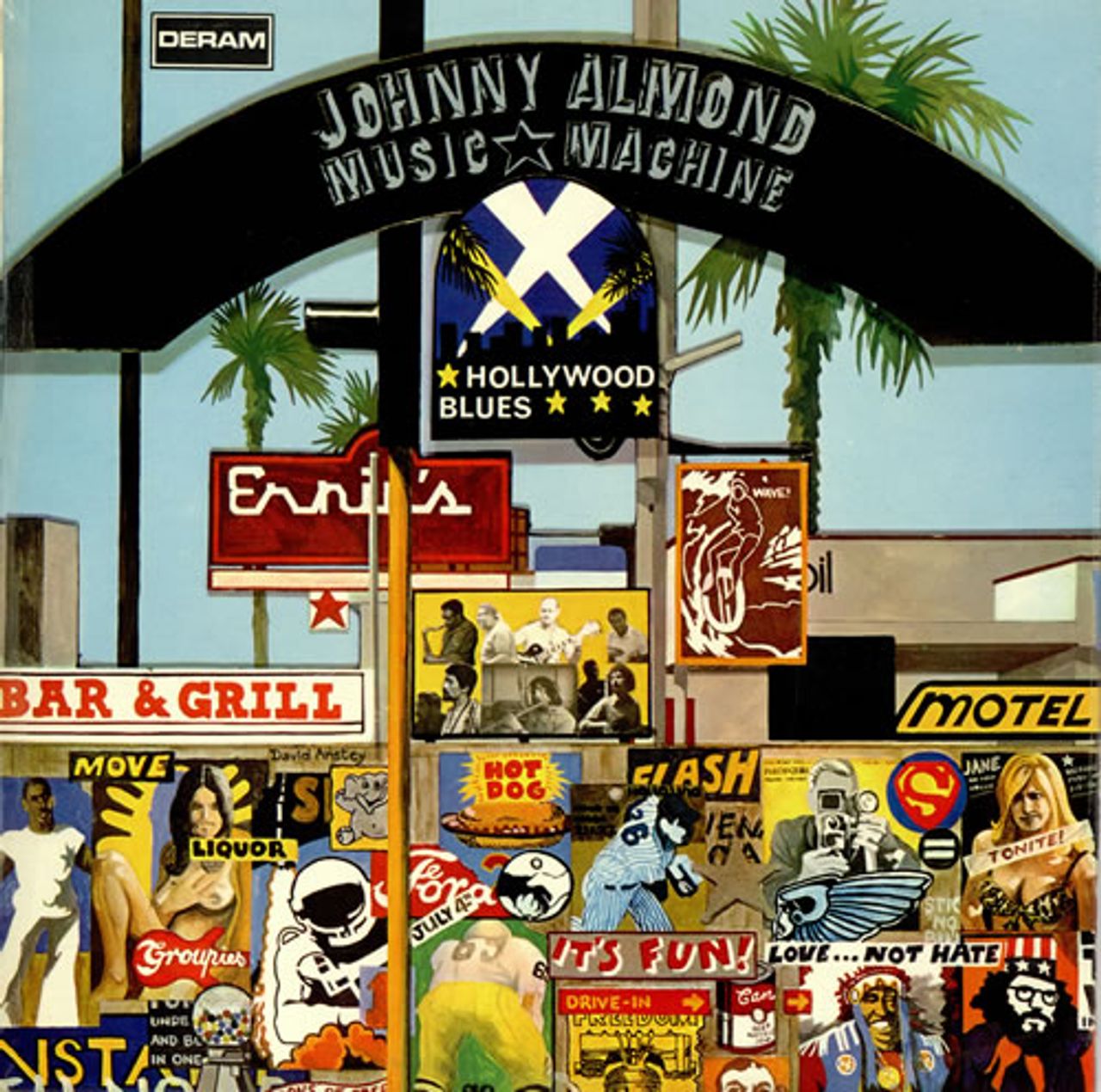JOHNNY ALMOND MUSIC MACHINE Hollywood Blues (Scarce 1970 UK 8-track LP on the collectable Deram label, in its rarer mono form. The Music Machine deliver a set of even funkier blues numbers as follow-up to their Patent Pending album, HollywoodBlues also stars Joe Pass on guitar. The front laminated picture sleeve, with die-cut mono/stereo hole on the reverse, is in remarkable condition for its age showing little shelfwear and is complete with its red bordered 'mono' inner. The vinyl isin near mint condition DML1057)