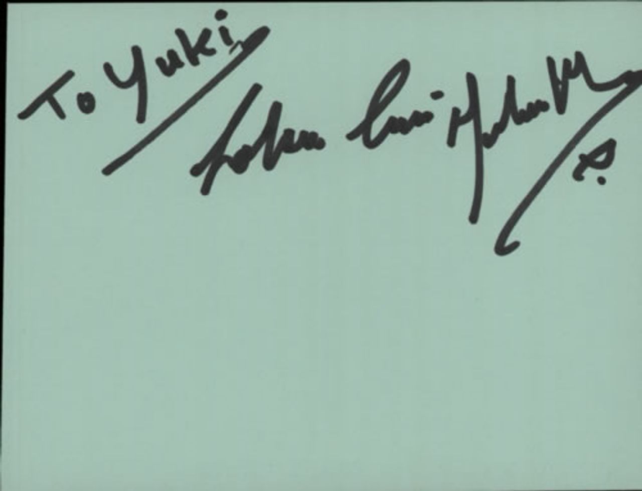 Signatures were obtained by Yuki Smythe-Park. For many years Yuki's husband Colin, was Eric Clapton's assistant tour manager, working on many of his 1980s concerts & tours. On August 26th 1990, Clapton played the Alpine Valley Music Theatre, Wisconsin, alongside Stevie Ray Vaughan & Double Trouble, Robert Cray and Buddy Guy. Following the show Colin Smythe, along with Clapton's agent Bobby Brooks, his bodyguard Nigel Browne and Stevie Ray Vaughan boarded a helicopter bound for Chicago. Tragically, the helicopter crashed shortly after take-off, killing all on board. Yuki was friends with many artists from that era and continued to attend gigs and fill her numerous autograph books. This signature was obtained in person by Yuki.