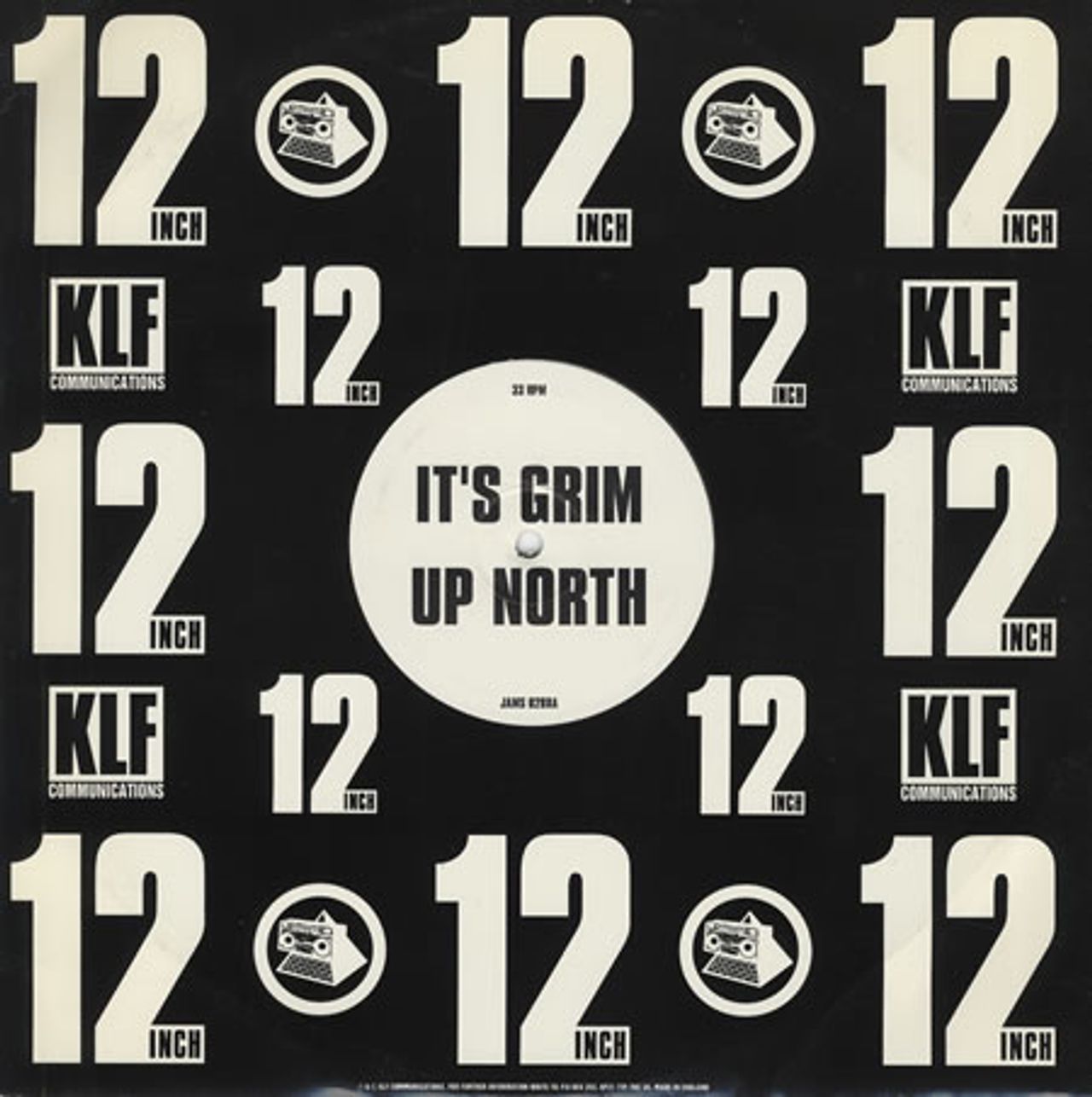 JUSTIFIED ANCIENTS OF MU MU It's Grim Up North (1991 UK 2-track promotional vinyl 12" including both Parts 1 & 2. There is some surface scuffs showing evidence of play to both sides but remains in excellent condition issued in the black & white KLF company die-cut card sleeve which shows just a little shelfwear to the edges JAMS028R)