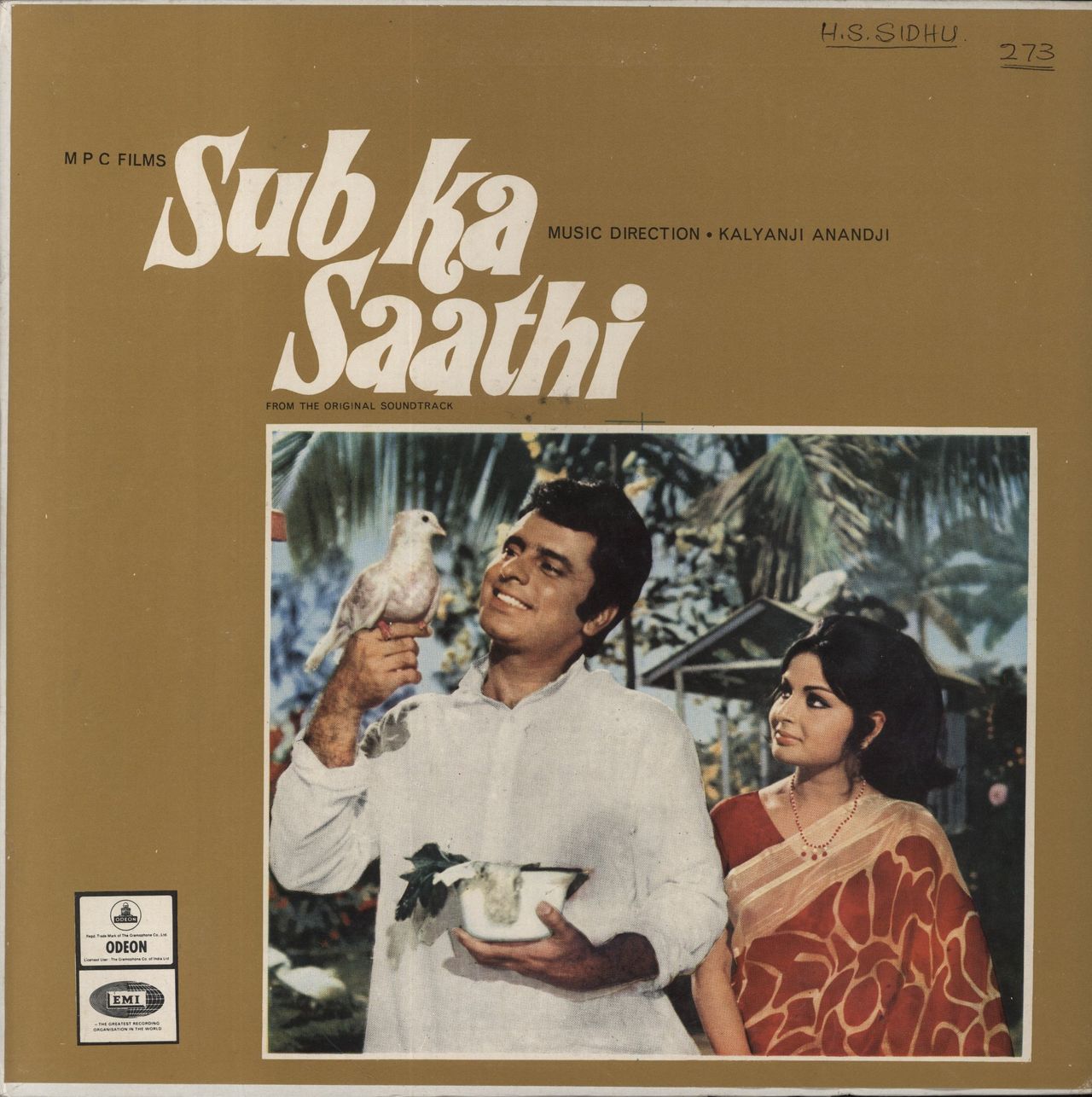 KALYANJI-ANANDJI Sub Ka Saathi (Scarce 1972 Indian 6-track vinyl LP on the black Odeon label, Kalyanji-Anandji's movie score featuring performances by Asha Bhosle, Mohd. Rafi and Lata Mangeshkar, pasted picture sleeve. The sleeve [G] has an area of moisture damage to the reverse and an annotation to the front, whilst despite annotations to the labels, the vinyl itself is Excellent and appears barely played MOCE4159)