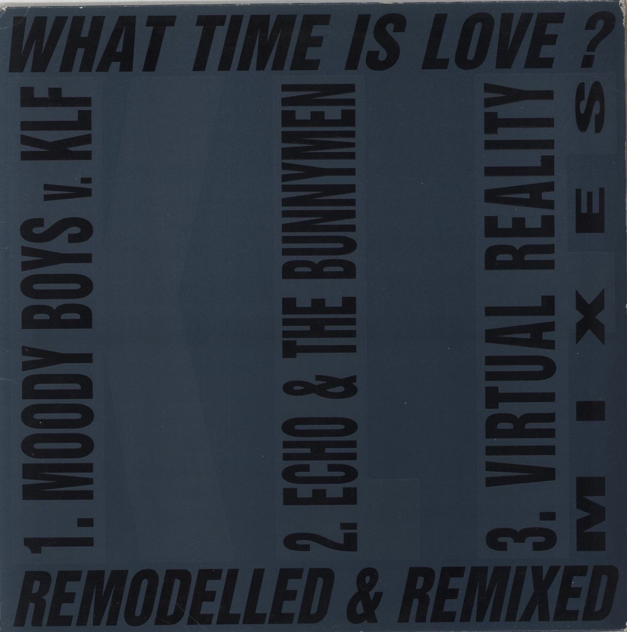 KLF What Time Is Love? - Remixes (1990 UK 3-track 12'' single, featuring Moody Boys Vs KLF, Echo & The Bunnymen and Virtual Reality Mixes. The title sleeve shows some wear to the edges and corners. The vinyl displays only light signs of play. KLF004Y)
