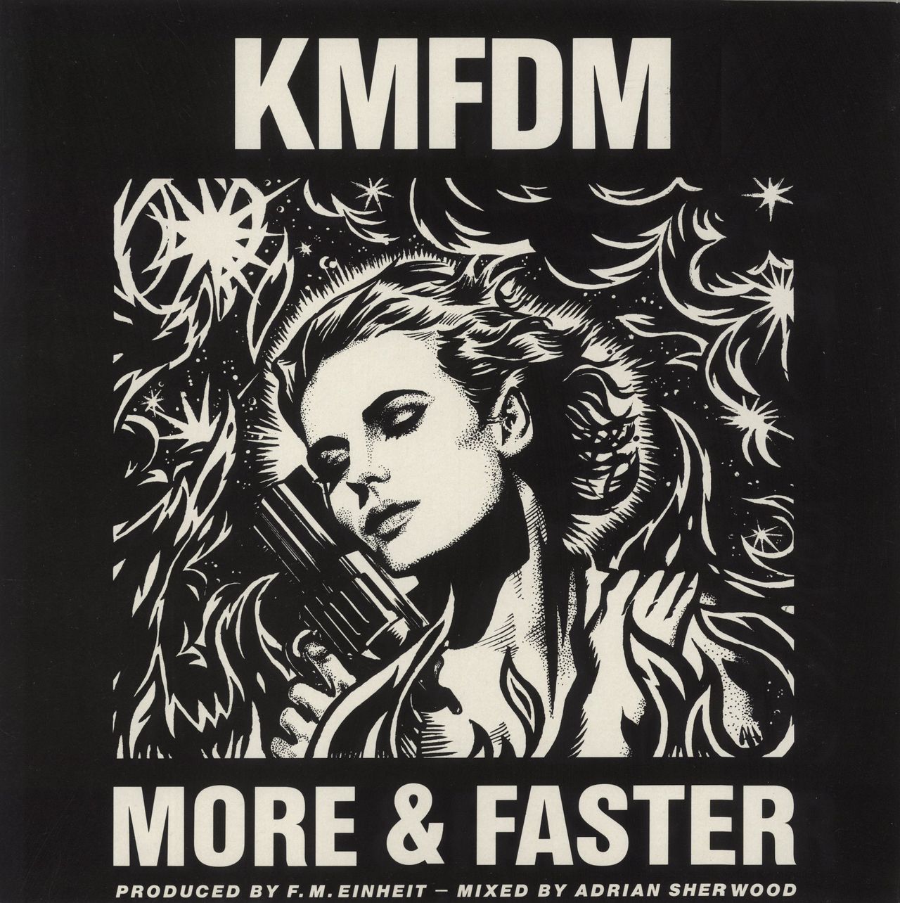 KMFDM More & Faster (1990's US Wax Trax label 3-track techno/dance crossover 12" vinyl single, mixed by Adrian Sherwood, also includes 'Rip The System' & 'Naff Off', picture sleeve. The sleeve shows just light wear, and the vinyl shows only light signs of play WAX-9077)