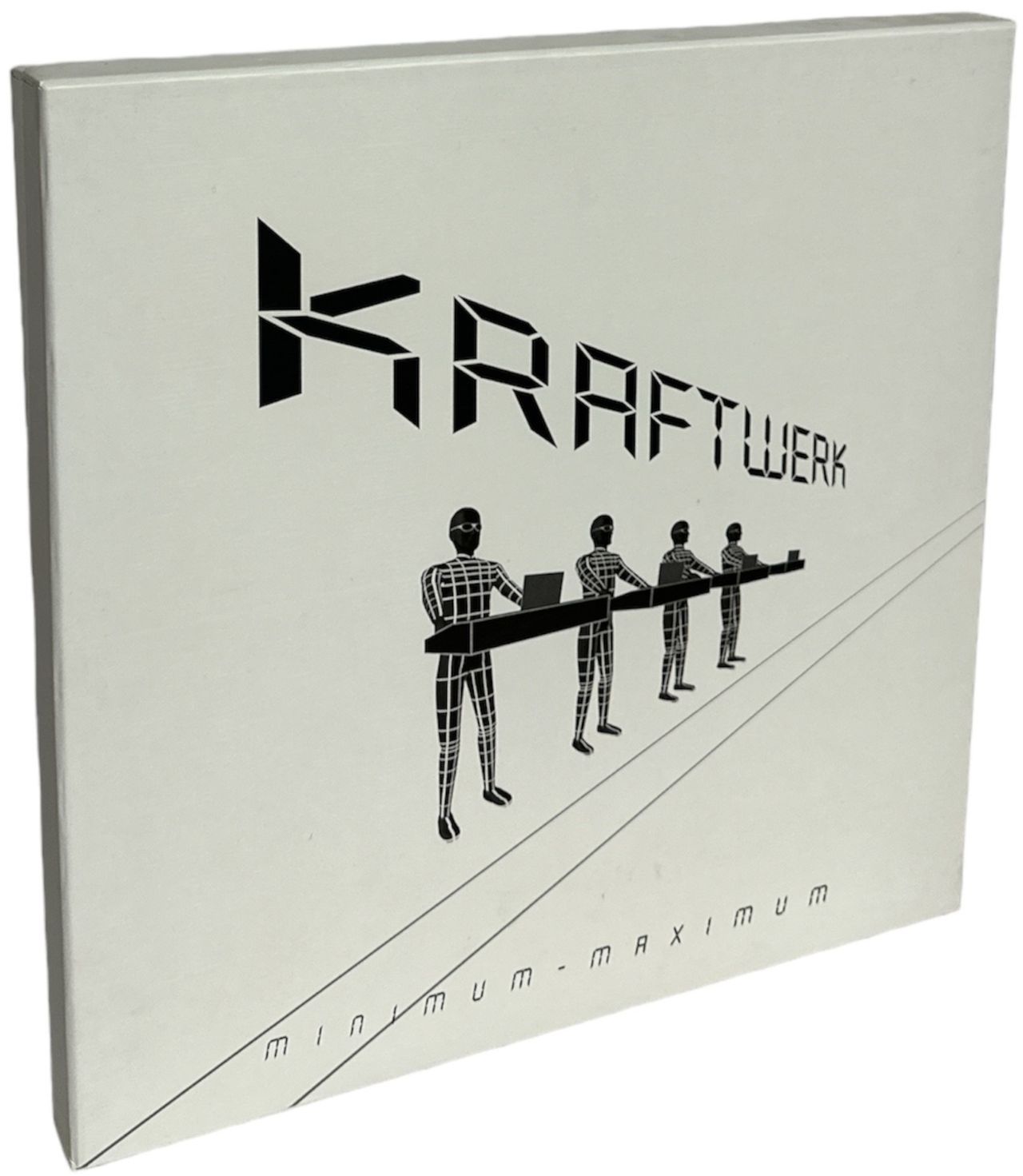 KRAFTWERK Minimum Maximum (2005 UK Quadruple LP box set featuring twenty two classic tracks, recorded and mixed by the pioneering electronic post punk futurists & captured live throughout Europe, Japan and the US during their sixty-ninedate 2004 World Tour which created a unique audio & visual spectacular. Each album has its own picture sleeve, with black inner sleeve, all housed in a stunning 12" picture box. The outer box shows just faint scuffing and the inners have slight seam splits along the bottom edges but the sleeves remain sharp and without any notable shelfwear. The vinyl are Excellent with only light signs of play and the odd cosmetic hairline)