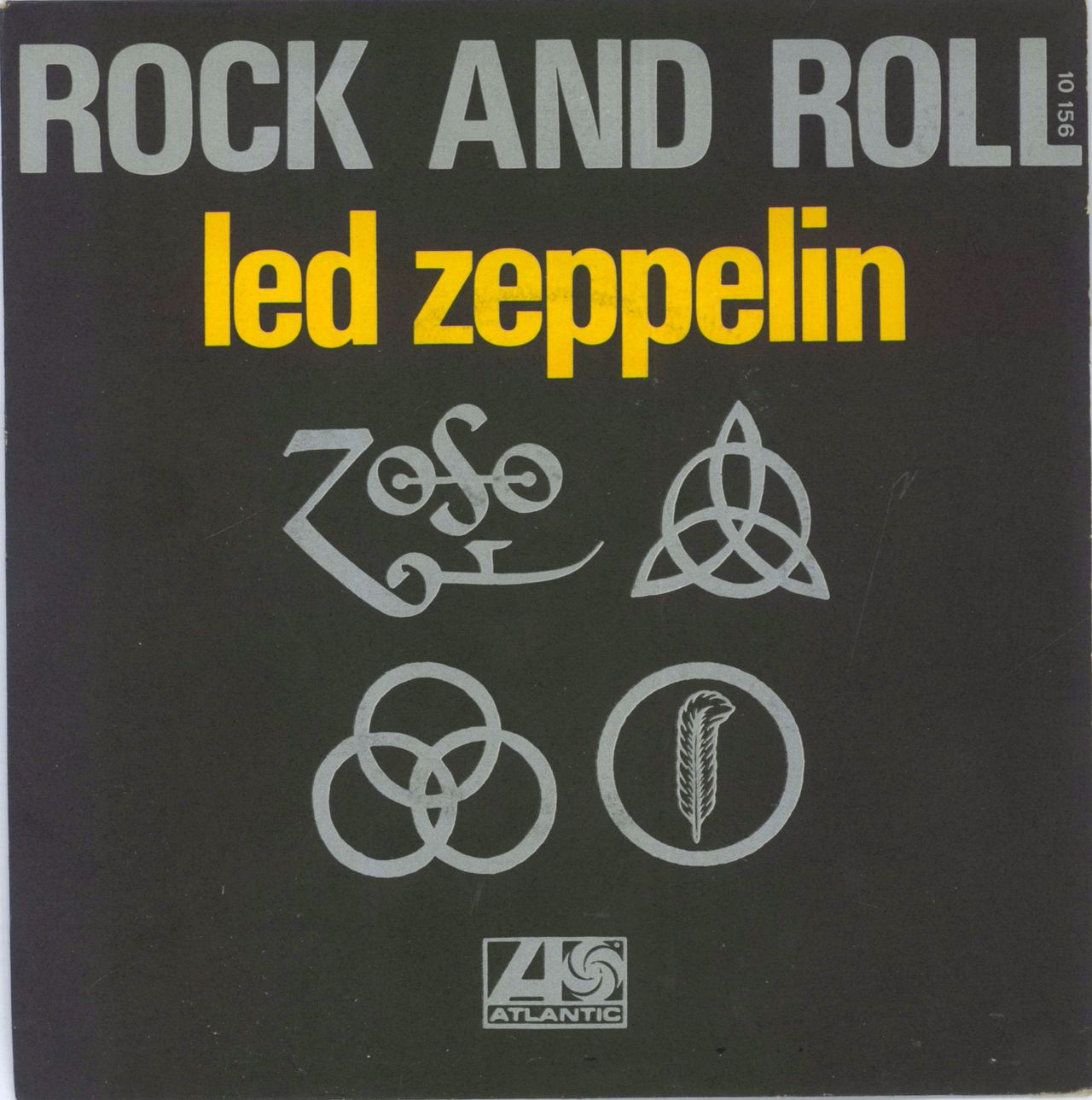 LED ZEPPELIN Rock And Roll (1972 French original wide centred 7" vinyl single with red Atlantic injection moulded labels, also includes Four Sticks, housed in a great unique black picture sleeve with 'Zoso' four symbol logos and silver and yellow titles. The sleeve displays just a little light wear with no splits or rips, and the vinyl shows just a little light signs of play. A really nice example)