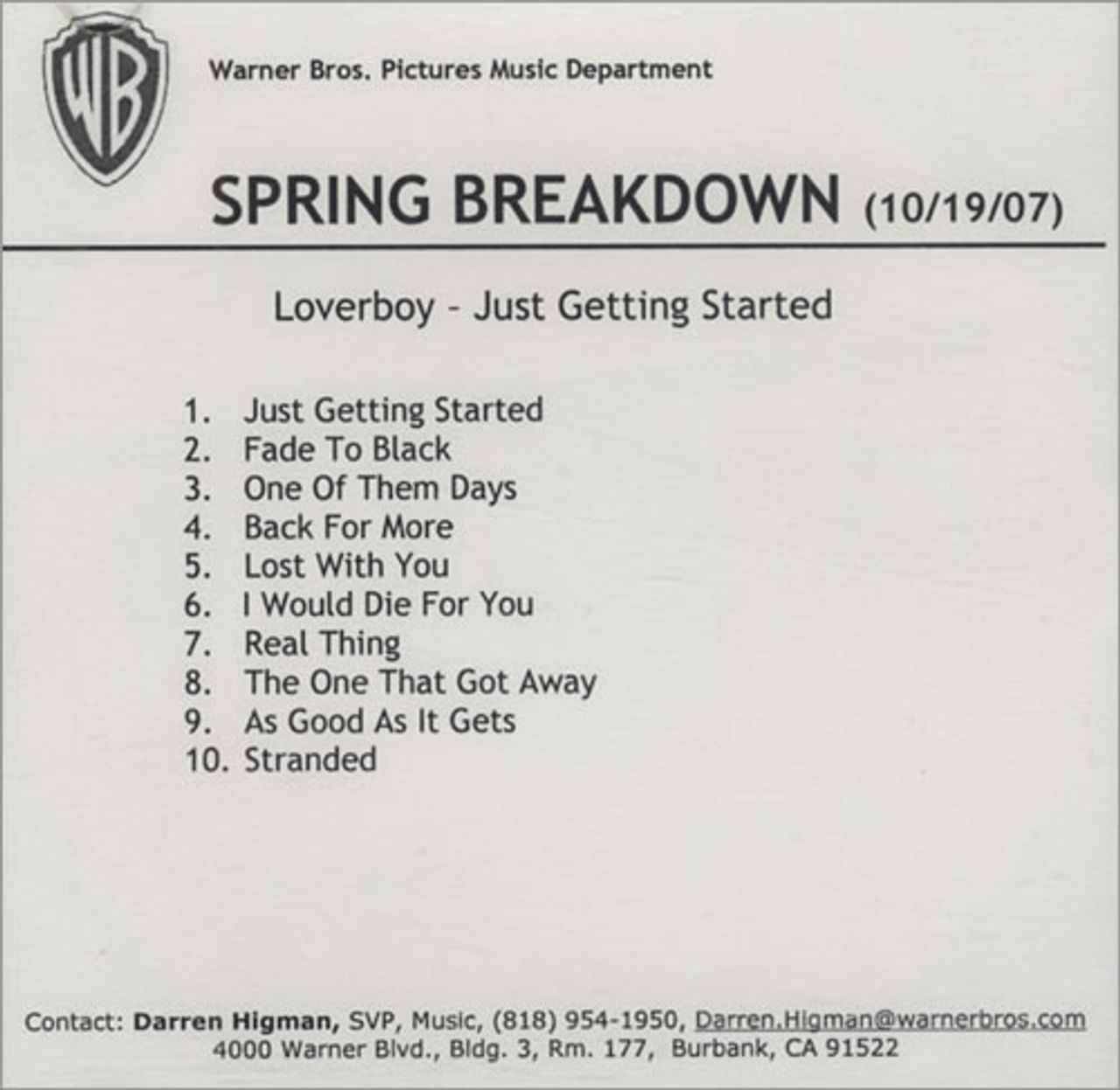 LOVERBOY Just Getting Started (Official 2007 US Warner label