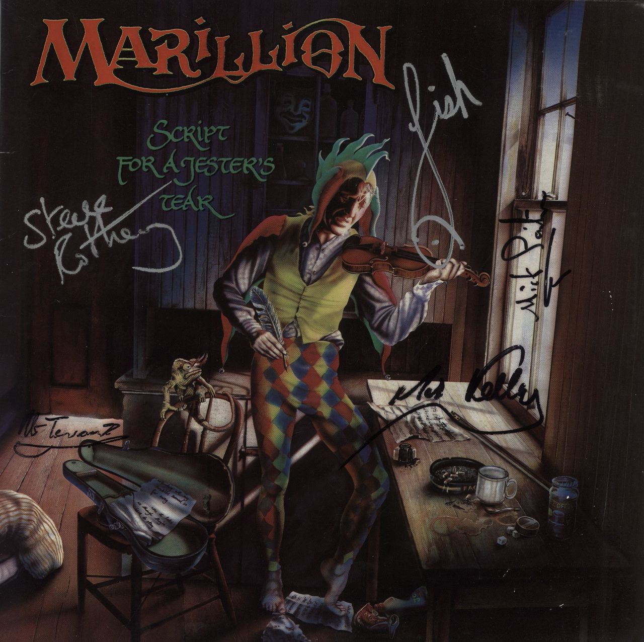 MARILLION Script For A Jester's Tear (Fully Autographed 1983 UK 6-track LP on the on cream label with black text and red perimeter text, the debut album by the neo-progressive rock group, including the singles He Knows You Know & GardenParty, housed in a lossyy non-barcoded gatefold picture sleeve. The sleeve has only light wear and the vinyl has minimal signs of play. This copy has been signed by Fish & Steve Rothery in silver and Pete Trewavas, Mark Kelly and originaldrummer Mick Pointer in black marker pen all on the front of the sleeve. Stunning and ideal to display on any fans wall!)