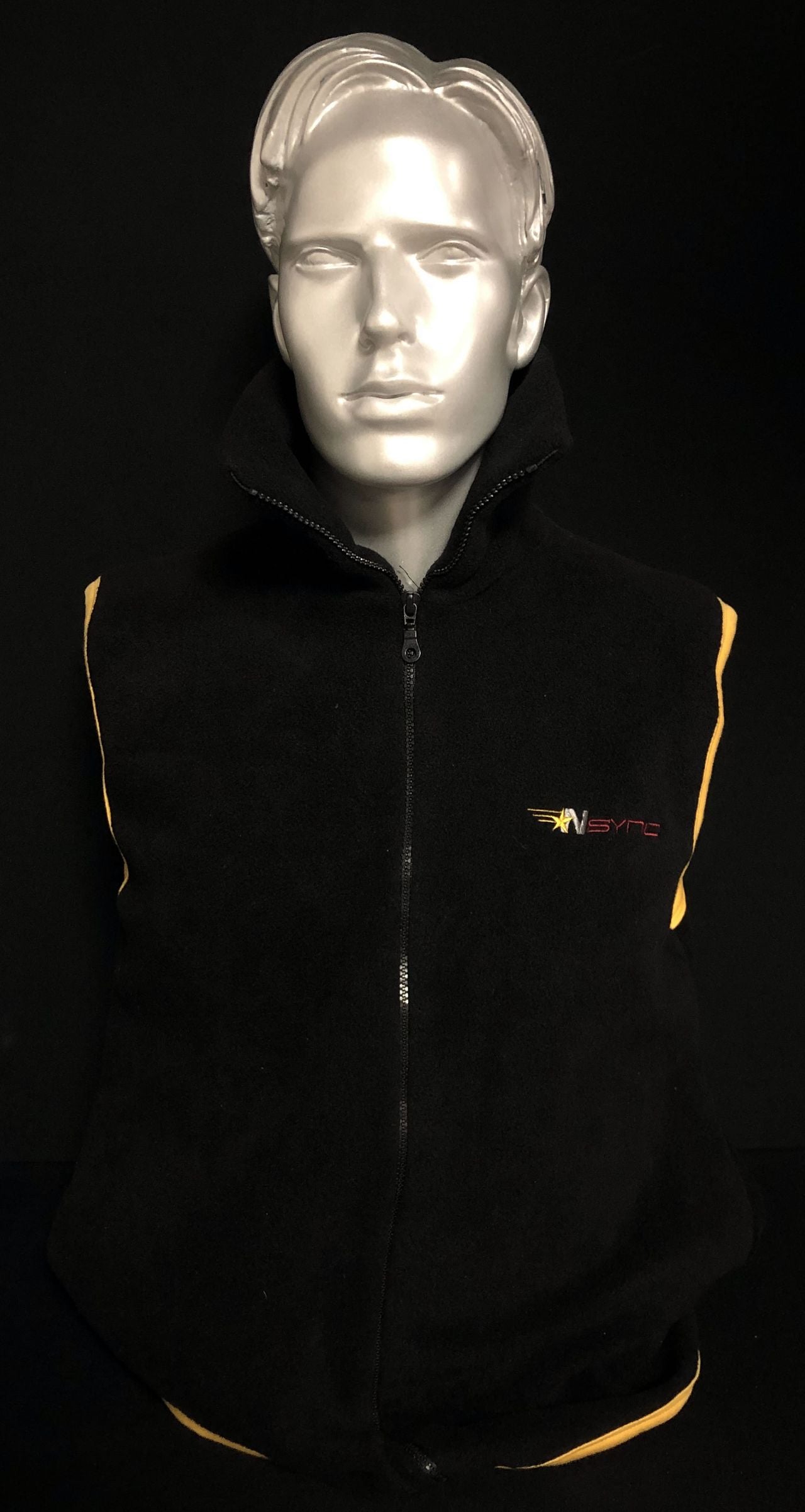 N SYNC N-Sync (UK Jive promo-only black turtle neck zip-up sleeveless fleece with side pockets, yellow sleeve and base trim and yellow, red & silver embroidered logo on left breast! size extra large)