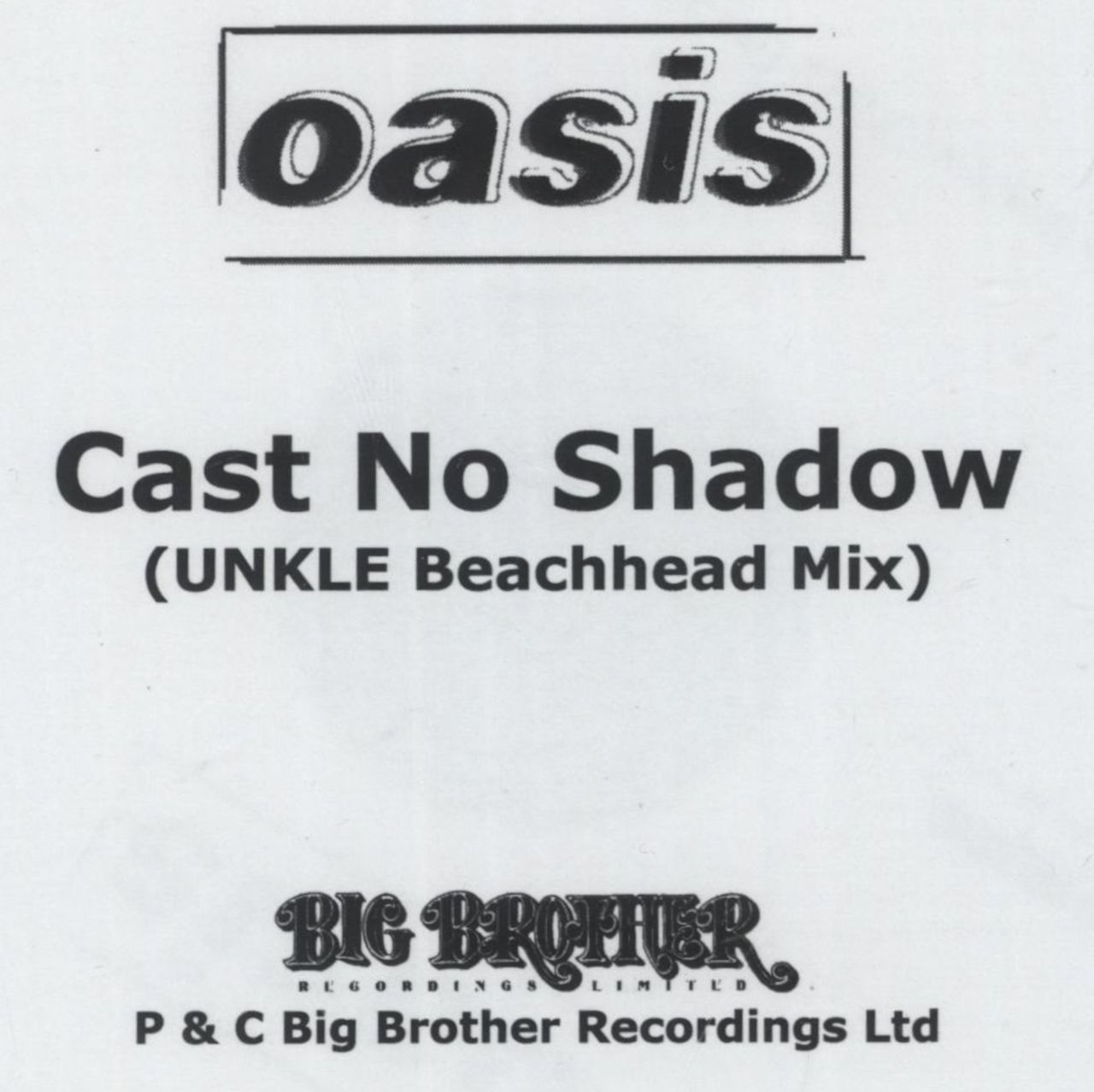 OASIS Cast No Shadow (2005 UK Big Brother 1-track 'UNKLE Beachhead Mix' advance CD-R acetate single, issued exclusively to radio stations and reviewers. The mellow Beachhead Mix brings something extra to an already great track, and remains unreleased as a single and featured on the 'Goal' movie soundtrack. Custom printed disc in a white titled company sleeve)