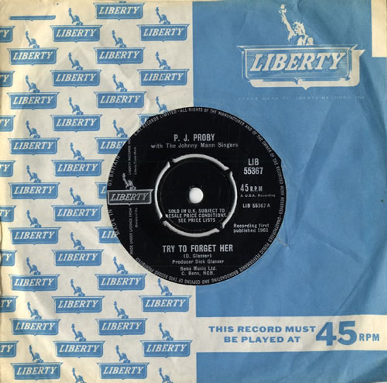 P. J. PROBY Try To Forget Her (1964 UK 7" vinyl single with intact four prong centre, also including There Stands The One, both Dick Glasser compositions and productions, company die cut paper sleeve. The vinyl appears seldom played LIB55367)