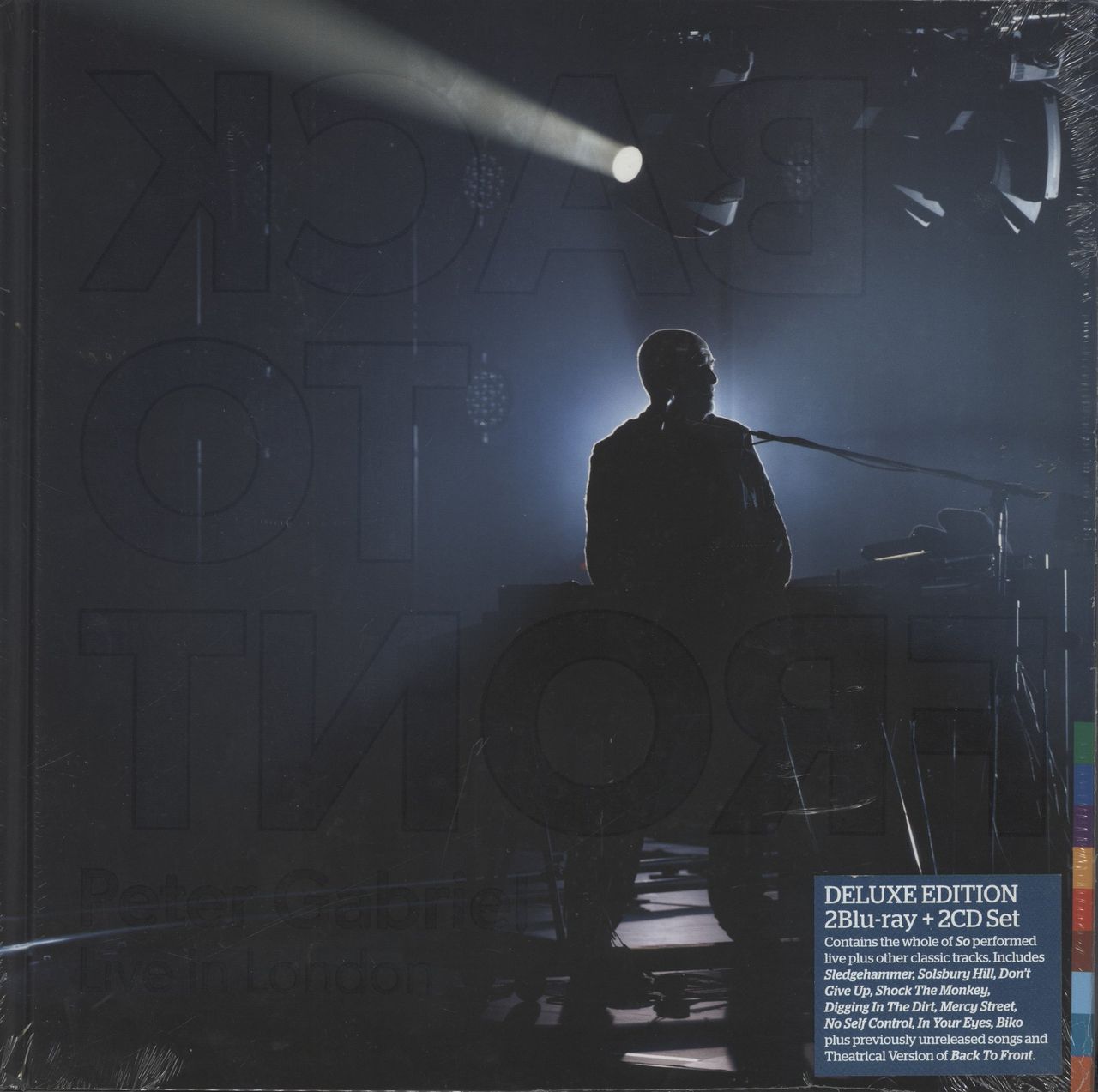 PETER GABRIEL Back To Front ( 2014 UK FOUR disc set including two BluRay(featuring the full concert film and theatrical film with interviews) and two audio CDs, all recorded and filmed live over two nights at the O2 in London and features ,to celebrate it's 25th anniversary, the fabulous 1986 breakthrough album 'SO' in it's entirety for the first time plus other classic tracks. All four discs are housed in a 30cm x 30cm hardback Mediabook including a 60-page booklet, containing credits and photos. This item is still sealed and hype stickered and in Mint condition ERBCD5227)