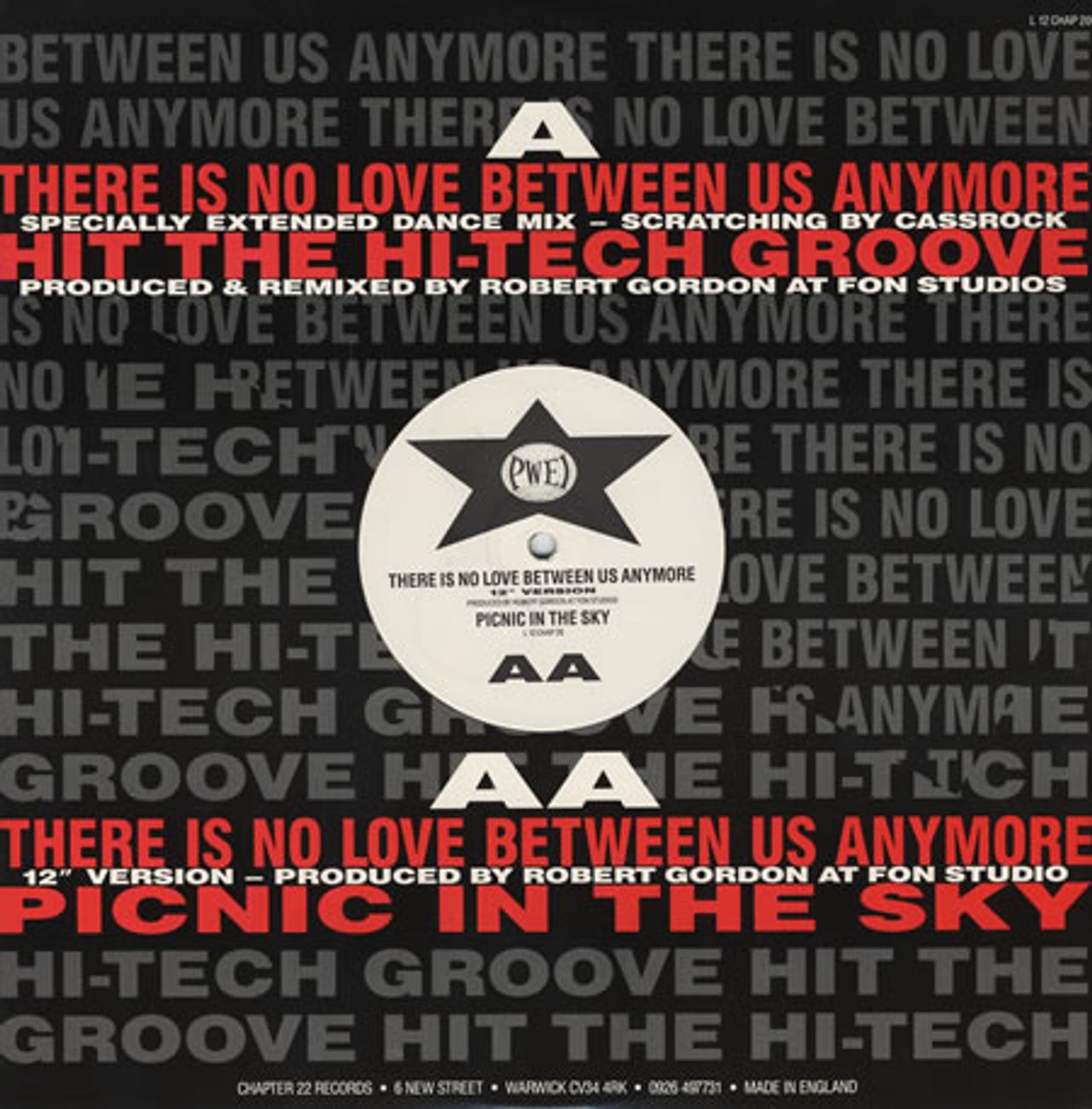P.W.E.I There Is No Love Between Us Anymore (Deleted 1988 UK 4-track 12" vinyl single, includes the Specially Extended Dance Mix, 12" Version, Hit The Hi-Tech Groove - M& K Mix and Picnic In The Sky, die-cut picture sleeve L12CHAP20)