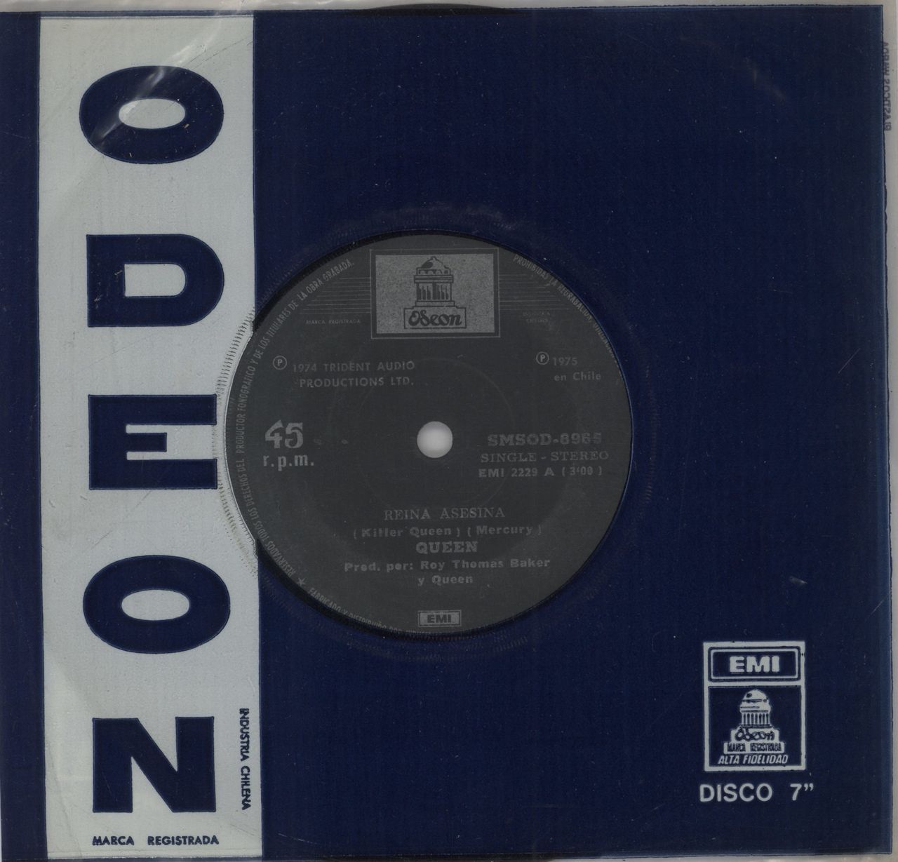 QUEEN Reina Asesina (Rare 1975 Chilean solid centre 7" vinyl on the black & silver EMI Odeon label, for the single Killer Queen, also including Moviendo Las Muñecas (Flick Of The Wrist) - titles listed in Spanish & English, housed in a plastic EMI Odeon 'Disco 7' blue & white company sleeve. The sleeve has only light wear, the vinyl is graded Very Good, with some noticeable surface marks and the occasional light scratch. Although not mint, this is still a nice example of one of the hardest pressings to find from Chile!)