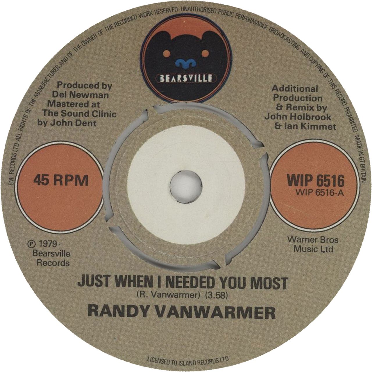 RANDY VANWARMER Just When I Needed You Most (1979 UK 7" vinyl single with intact 4-prong centre, also featuring Your Light, plain white die-cut paper sleeve WIP6516)
