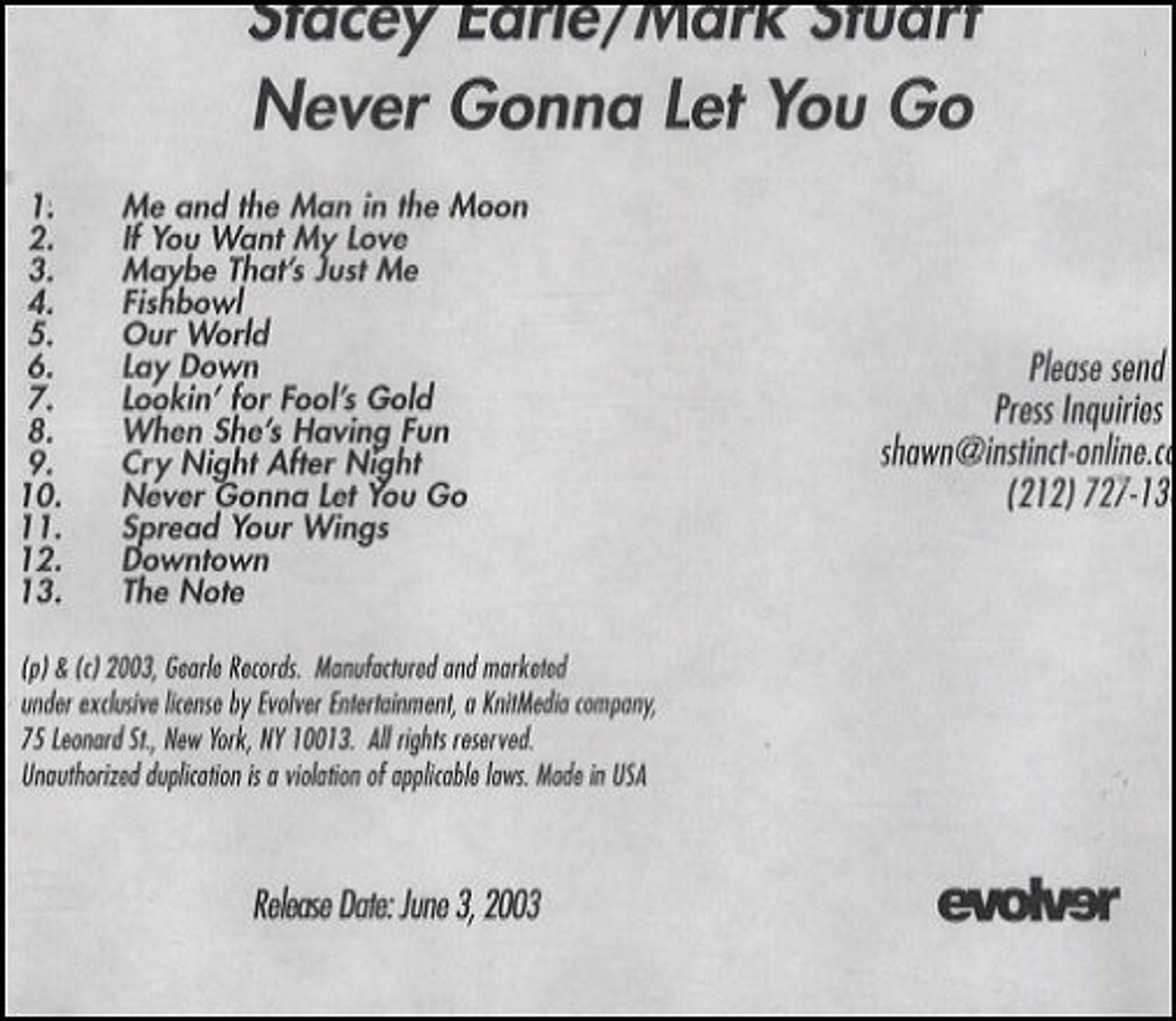 STACEY EARLE/MARK STUART Never Gonna Let You Go (2003 US
