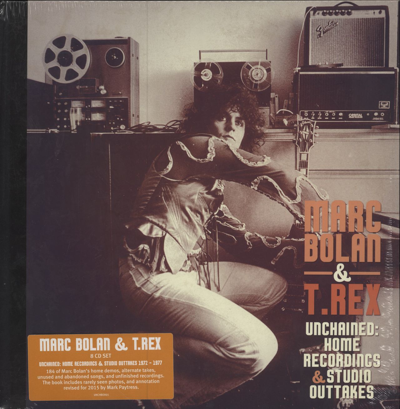 T-REX / TYRANNOSAURUS REX Unchained: Home Recordings & Studio Outtakes 1972–1977 (2015 UK Deluxe Edition 8-disc set containing the eight albums including Marc Bolan's home demos, alternate takes, unused & abandoned songs and unfinished recordings, first issued individually back in mid-1990s. All housed together inside a sealed & stickered 12" hardback book package which boasts brand new artwork and updated sleevenotes from Mark Paytress. This copy remains sealed therefore the contents are Mint UNCHBOX01)
