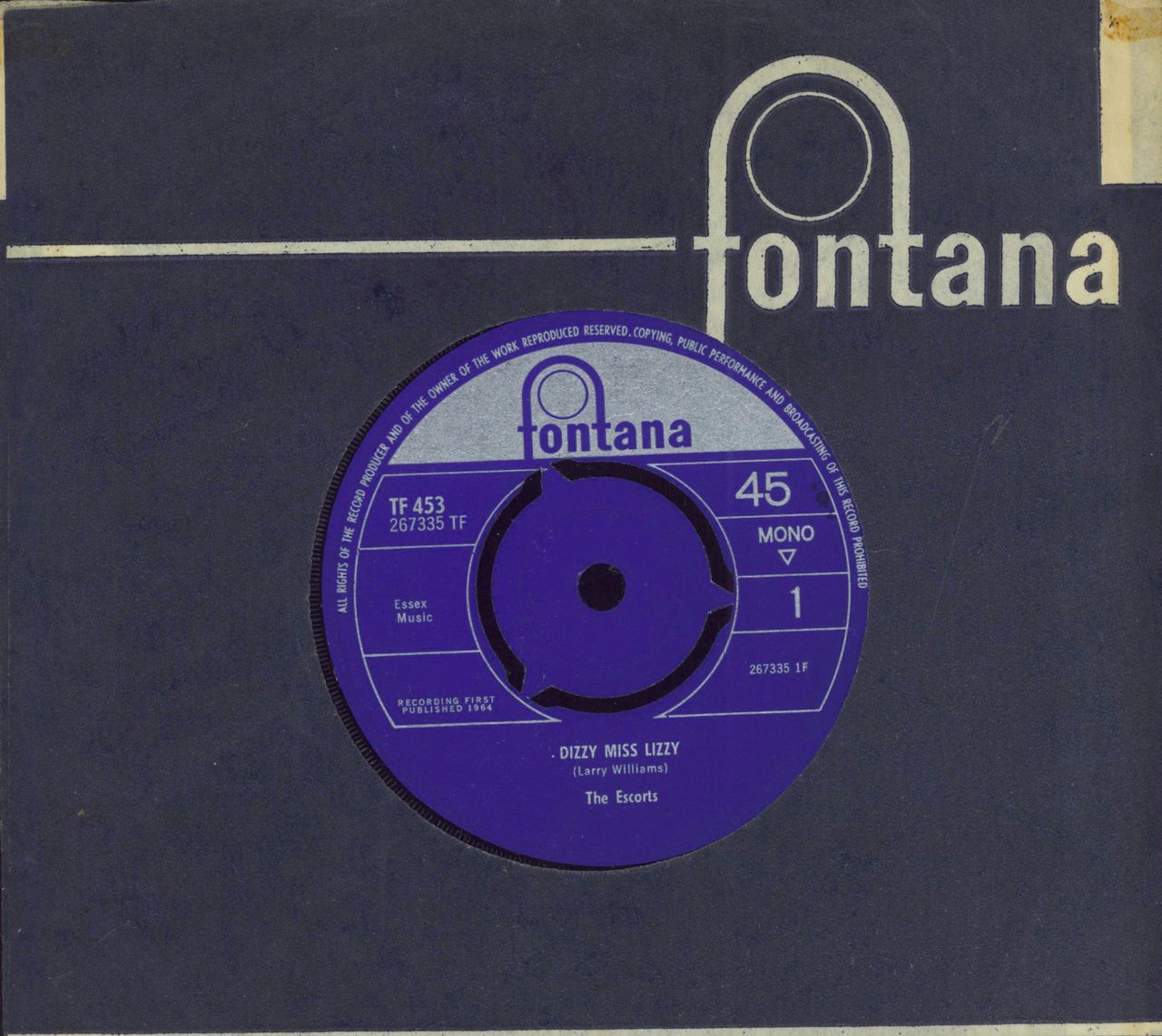 THE ESCORTS Dizzy Miss Lizzy (1964 UK Mono 7" vinyl single with an intact three prong centre, also including All I Want Is You, within a Fontana company die-cut paper sleeve. This one previous owner copy is in a fantastic condition, the labels have no spindle marks and the vinyl looks to have never seen a turntable!)