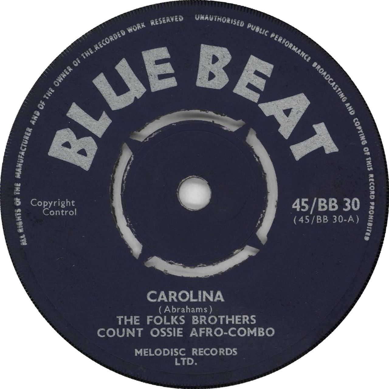 THE FOLKS BROTHERS Carolina (1960 UK four-prong centre 7" single on the dark blue & silver Blue Beat label, produced by Prince Buster. This was a big hit that put Ska & Reggae music on the map [probably twice, when Shaggy covered it in the nineties!] & is backed with 'I Met A Man' by the Count Ossie Afro-Combo, plain die-cut sleeve. The vinyl grades VG+ with no writing or tears on the labels & shows some light paper scuffs & hairlines not upsetting play)