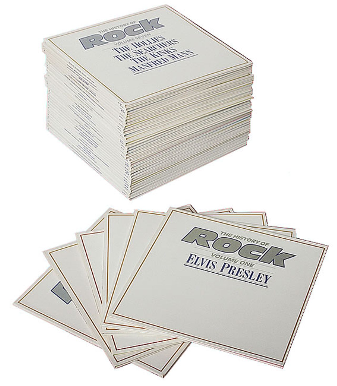 VARIOUS ARTISTS The History Of Rock (Amazing 1982 UK complete set of all FORTY volumes of the Orbis Publishing 'History Of Rock', with each [mostly] double LP volume featuring a collection of classic recordings by the original artists from Elvis, through The Beatles, Rock, Glam, Punk & The Sex Pistols to Elvis Costello. Each volume has a similar style gatefold sleeve with extensive notes inside. The Beatles volume is of particular interest as the second disc contains the Hollywood Bowl recordings from 1964-65. The overall condition of the sleeves is excellent with just a little discolouration in the spine edges and some creasing and edgewear on each sleeve. However, the vinyl discs themselves show few signs of play; each remaining Excellent . A fantastic set at a fraction of the price that you would pay to purchase them individually! HRL001-040)