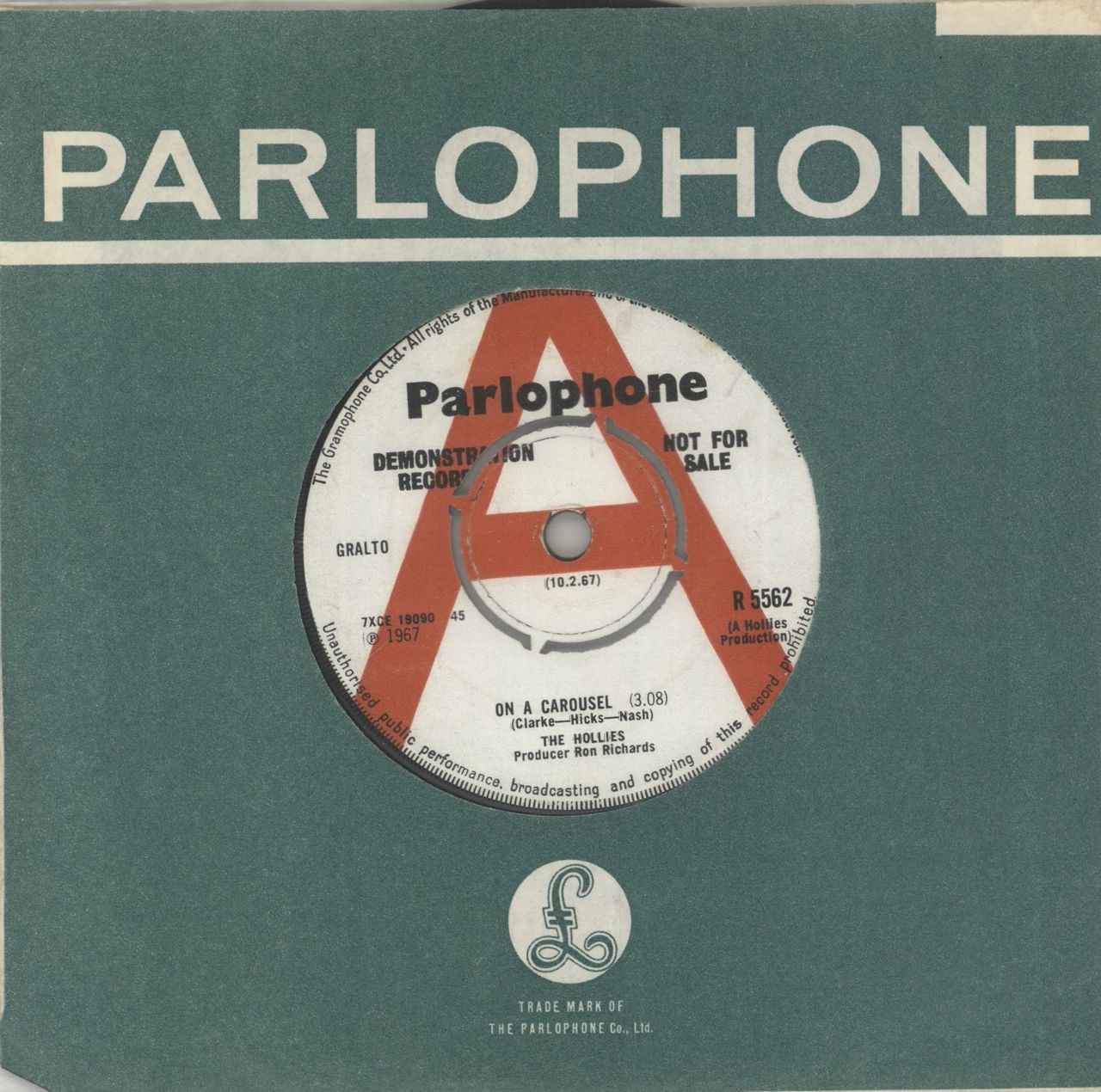 THE HOLLIES On A Carousel - A Label - VG (Scarce 1967 UK 'A' label promotional vinyl 7" for the single release with four prong centre and '10.3.67' release date text in the middle, also including All The World Is Love, Parlophone company die cut paper sleeve. The labels are clean & free from writing and the vinyl is Very Good with just a couple of light scuffs to indicate play - a fine example R5562)