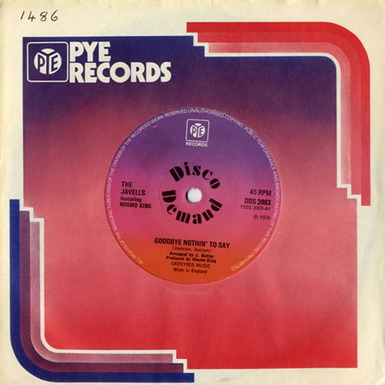 THE JAVELLS featuring NOSMO KING Goodbye Nothin' To Say (1974 UK solid centre 7" vinyl single, also including Nothin' To Say, Pye company die cut paper sleeve DDS2003)