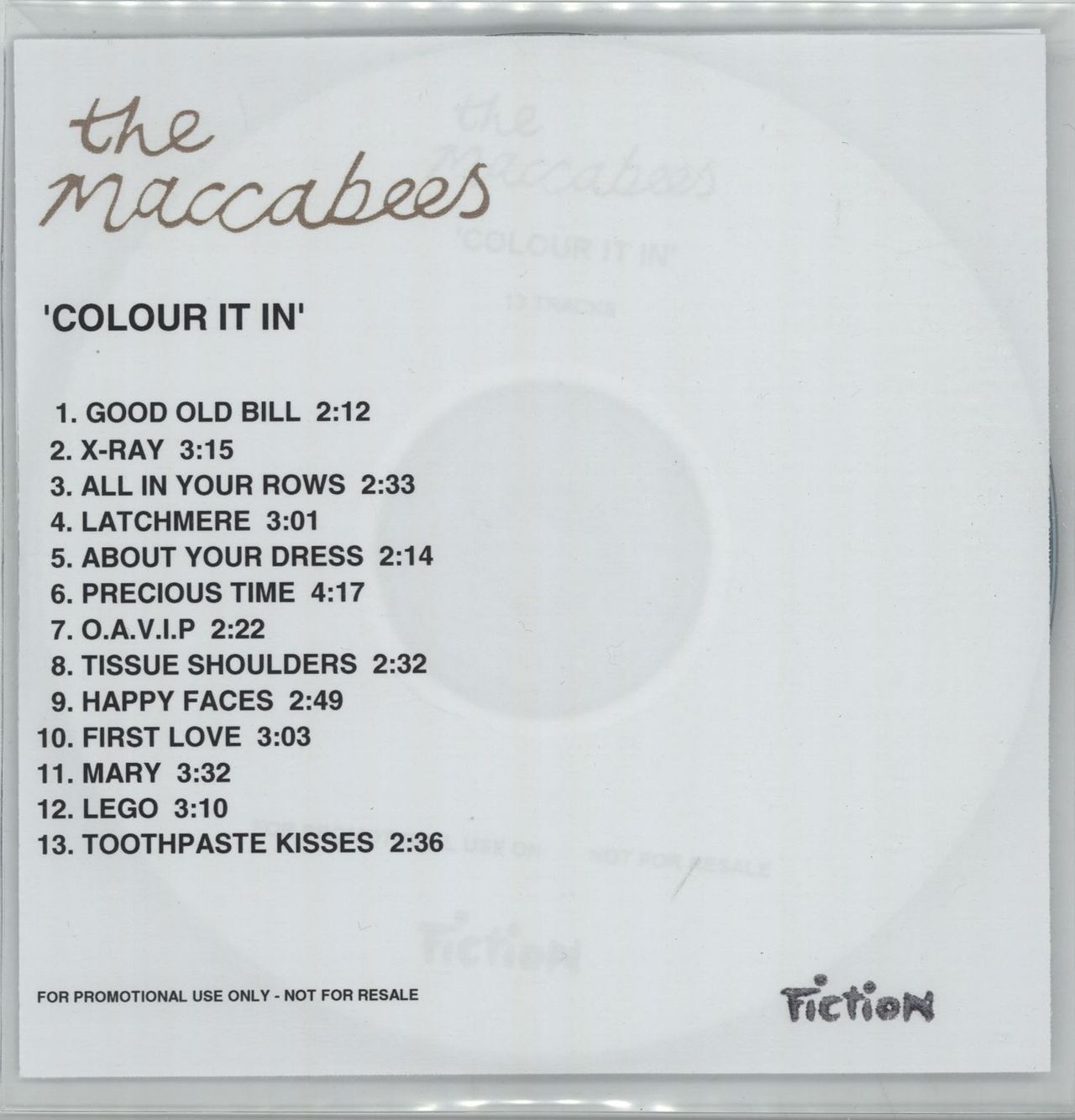 THE MACCABEES Colour It In (2007 UK Fiction label 13-track promotional CD-R for their debut album including X-Ray, Latchmere, First Love, About Your Dress, Precious Time and Toothpaste Kisses. The custom printed disc comes issued in a clear PVC wallet sleeve with the wrap-around title / tracklisting)