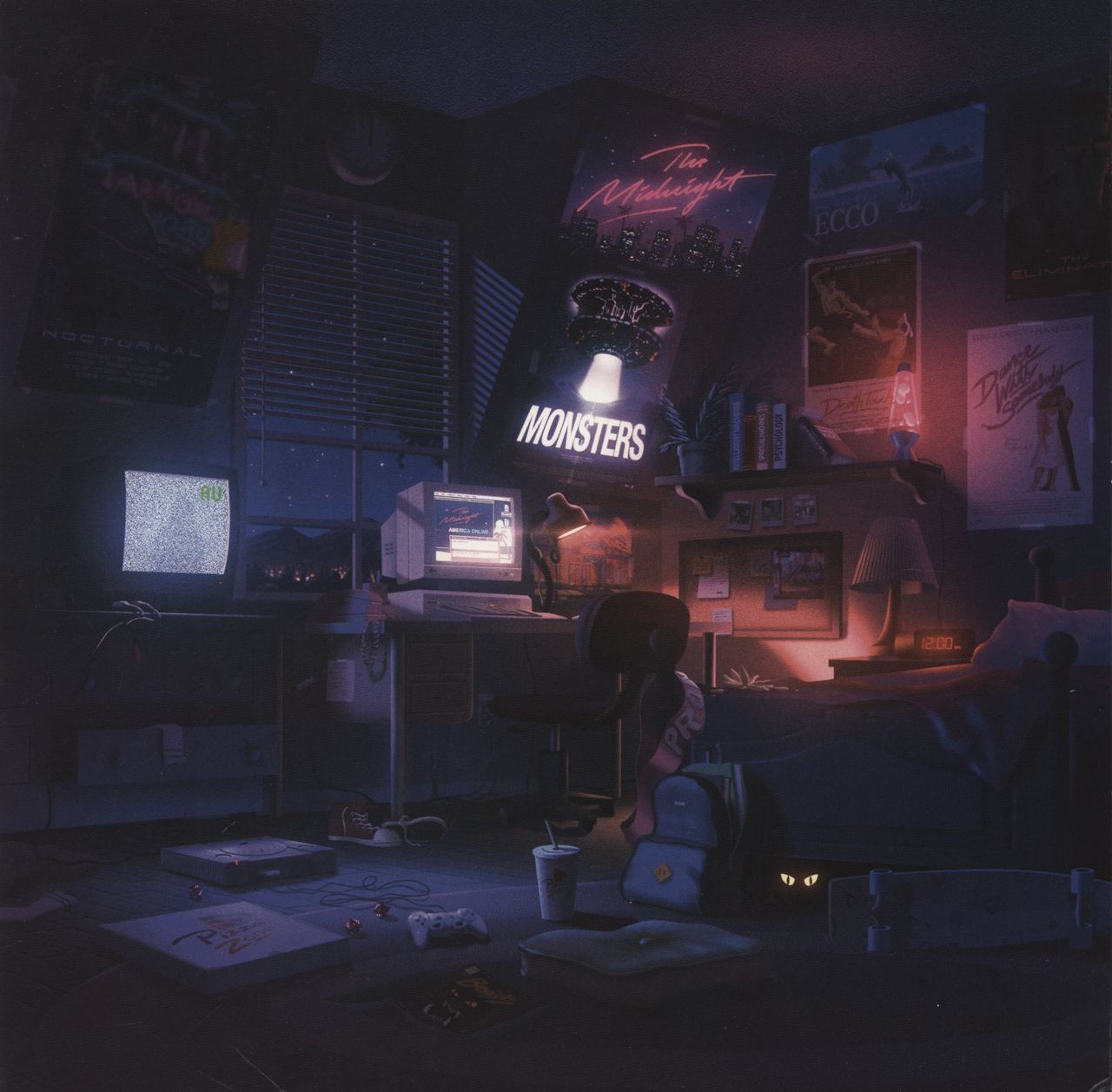 THE MIDNIGHT Monsters (2021 US limited edition 15-track double LP, with gatefold picture sleeve and printed inners, pressed on Clear with Purple Splatter Vinyl , the third studio album from the US-based duowho produce an '80s influenced combination of Synthwave, Dreamwave & Retrowave; including the singles America Online, Deep Blue, Dance With Somebody and Prom Night. The sleeve has a bump to the bottom right corner and one of the inners shows a couple of pressue marks. The vinyl remain in Near Mint condition COUNT198)