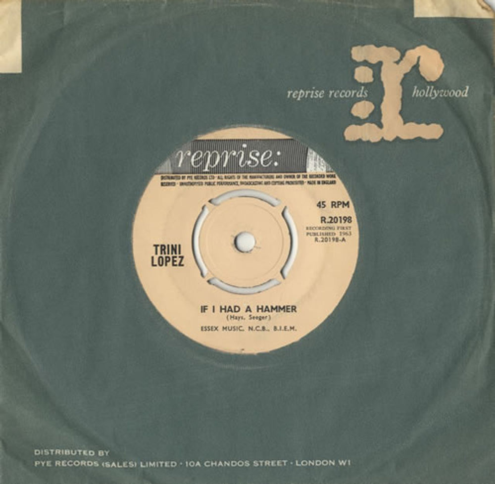 TRINI LOPEZ If I Had A Hammer (1963 UK 7" vinyl single with intact four prong centre, also including Unchain My Heart, record company die cut paper sleeve. This copy has a small notated label on the vinyl label, the vinyl itself however shows signs of play but is in great condtion for its age R.20198)