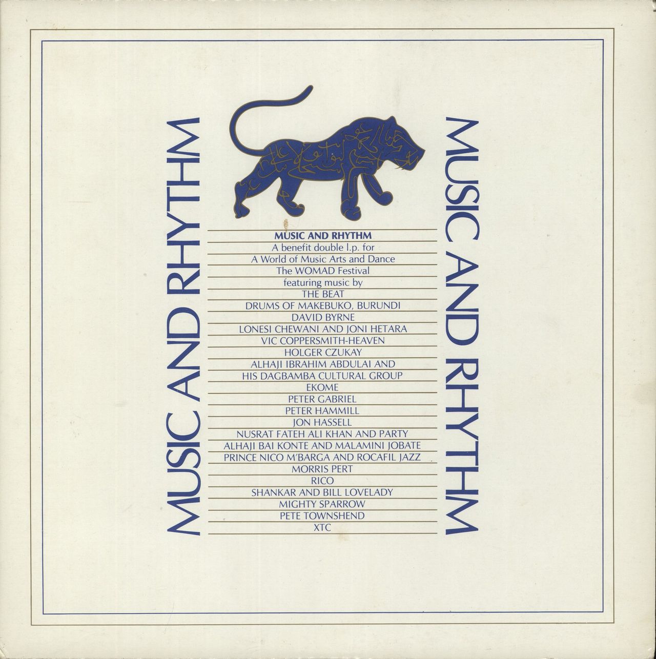 VARIOUS Music And Rhythm (1982 US 21-track benefit double vinyl LP for 'A World Of Music Arts And Dance' [The Womad Festival], featuring tracks by Peter Gabriel, Peter Hammill, David Byrne, Jon Hassell, Shankar, Holger Czukay, XTC, Pete Townshendand more, gatefold picture sleeve with deletion saw cut to the spine. The sleeve shows minimal shelfwear & the vinyl is excellent with little signs of play PVC201)